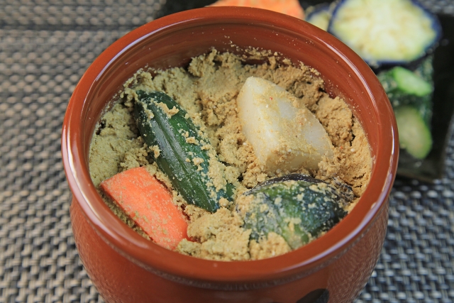 塩や米ぬかに野菜を漬け込む手の動き。